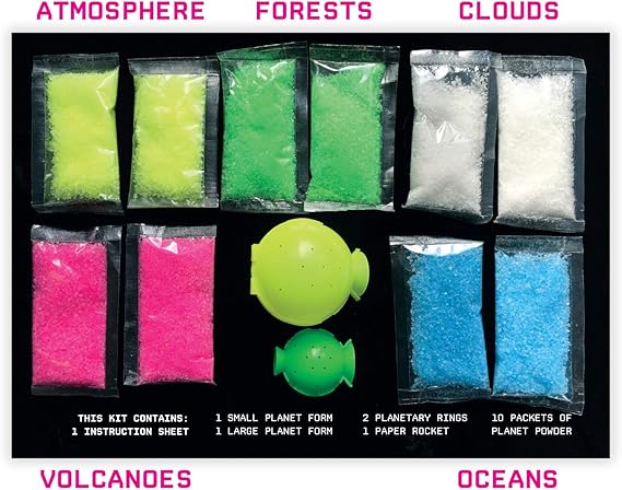 • Package Contents: 10 colorful packets of planet making powder, 2 planet form molds, planetary rings, space ship