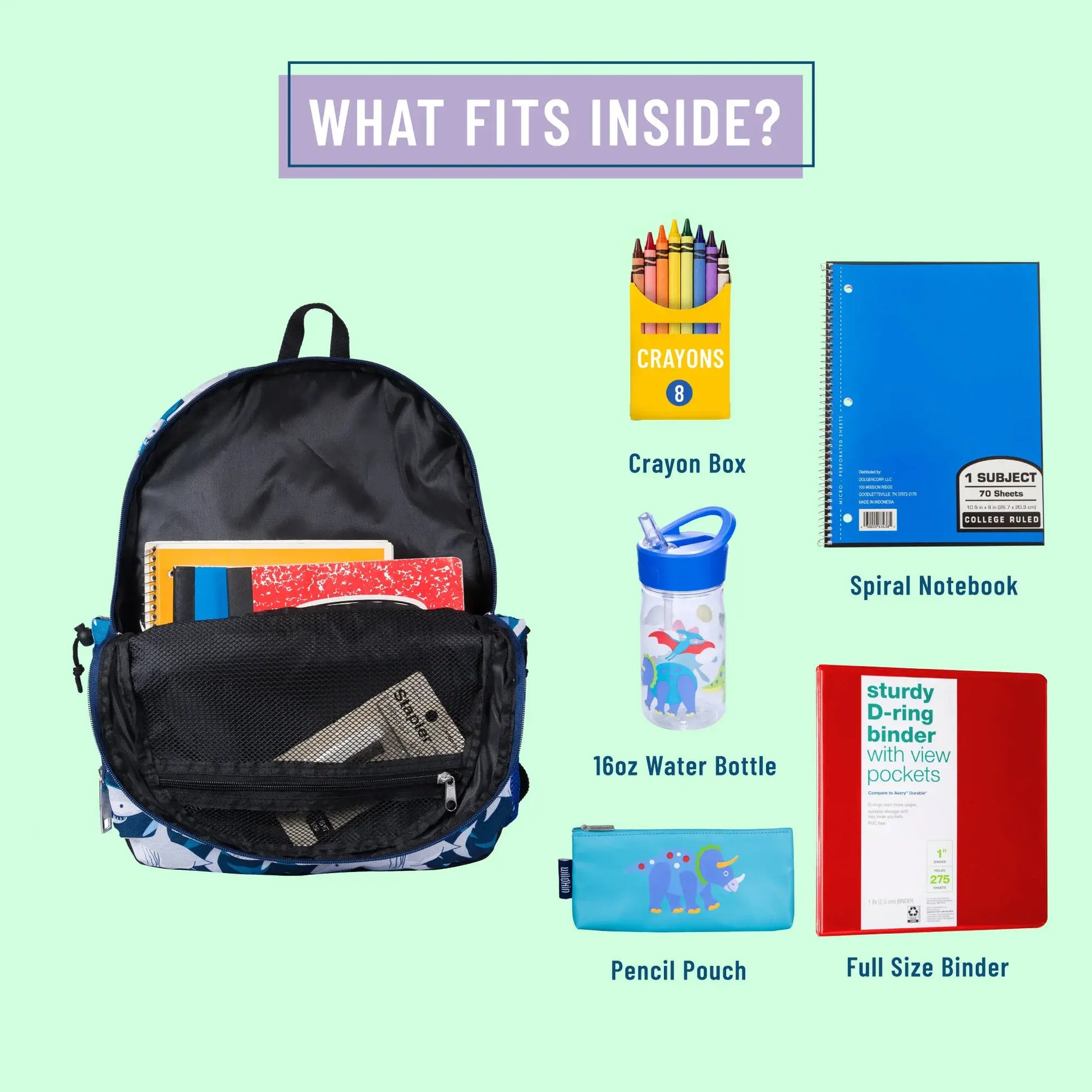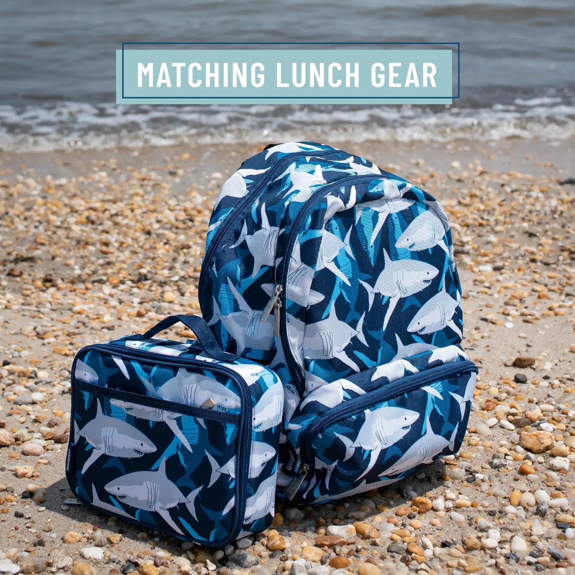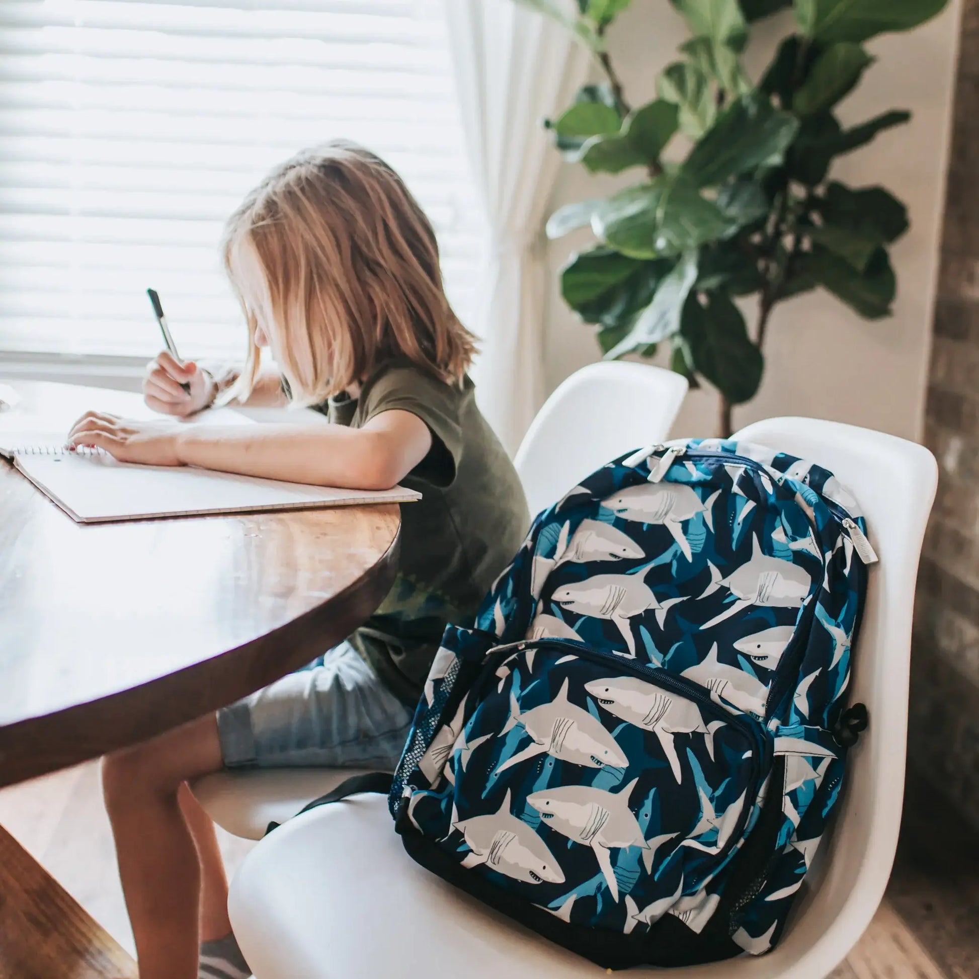 Your child will be the talk of the playground with the Wildkin sharks blue 17-inch backpack for boys and girls! Measuring 17 x 12 x 9 inches, the 17-inch backpack has a just-right size that’s perfect for packing all the essentials, plus some snacks! With backpacks, it’s all about the features, and Wildkin’s 17-inch backpack is full of features that put the “fun” in “functionality”. two padded, adjustable shoulder straps and a padded back provide comfortable wear, while the durable top handle is perfect for hanging in a locker before heading to class. Its three zippered compartments, two side water bottle pockets, and interior utility pockets and mesh pencil holder make organization a breeze, so your child can find what they need in a snap. We’ve designed our 17-inch backpack to withstand even the toughest, homework-filled school days.