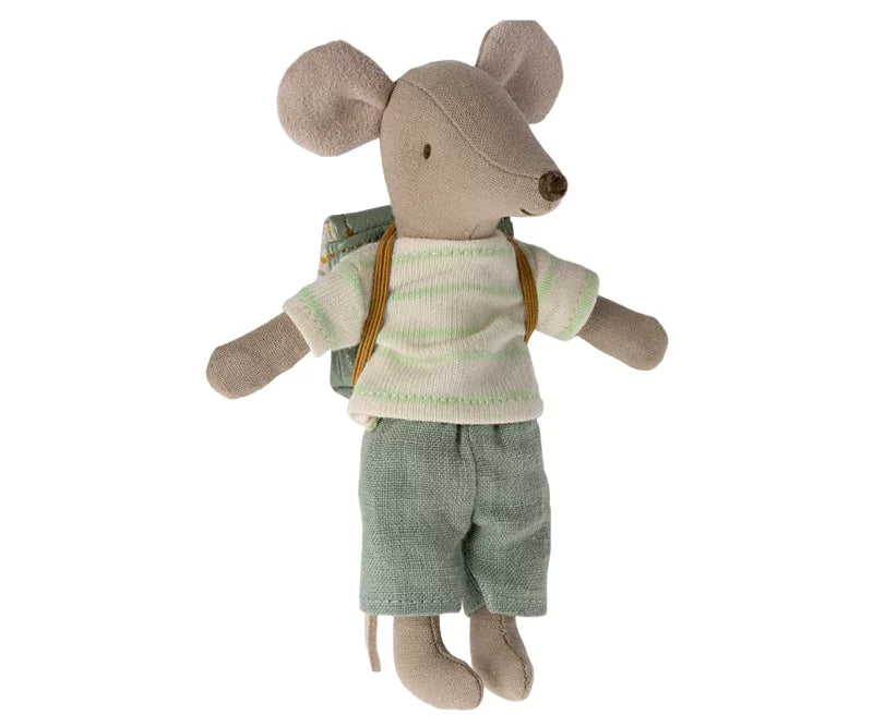 Big brother mouse is dressed for a day at school, carrying his backpack along with him. He has magnets in his hands so he can hold the handles of the tricycle when he rides quickly home from school.